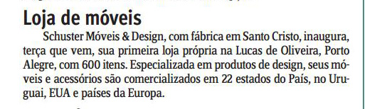 Schuster Móveis & Design, com fábrica em Santo Cristo, inaugura terça que vem (08) sua primeira loja própria na Lucas de Oliveira, Porto Alegre, com 600 itens. Especializada em produtos de design, seus móveis e acessórios são comercializados em 22 estados do País, no Uruguai, EUA e países da Europa.