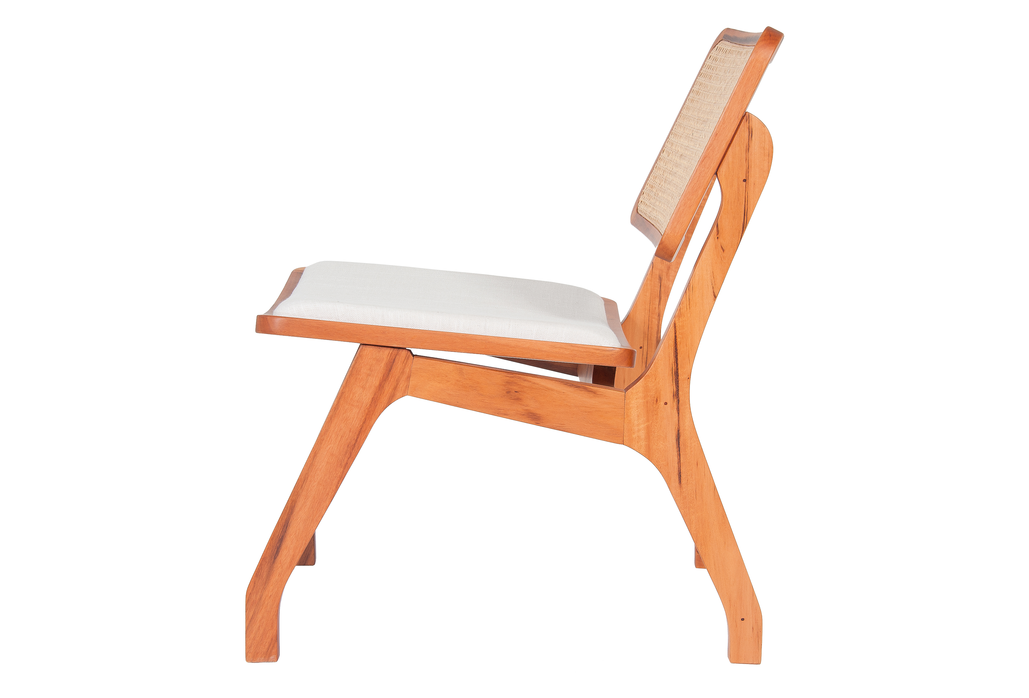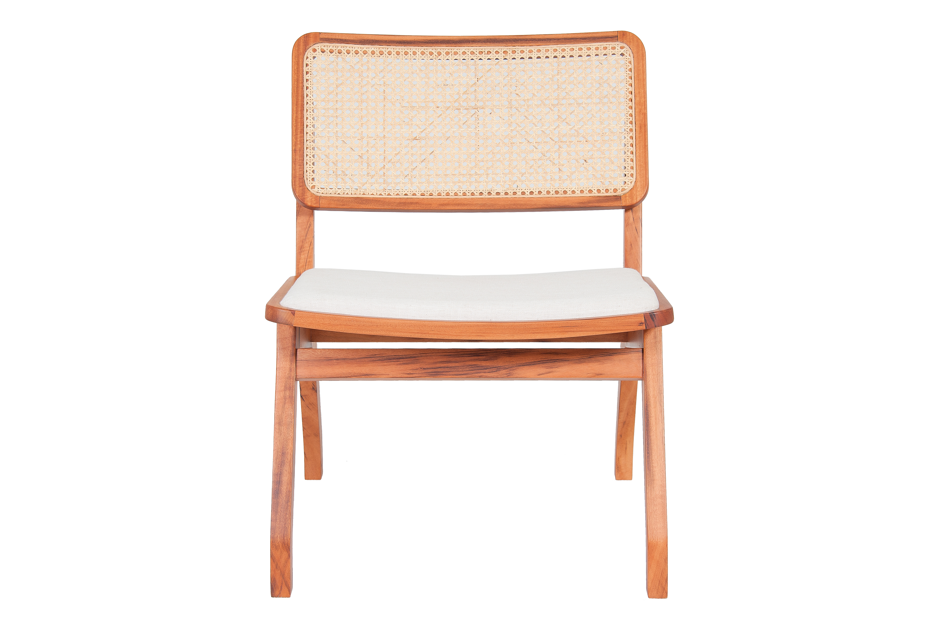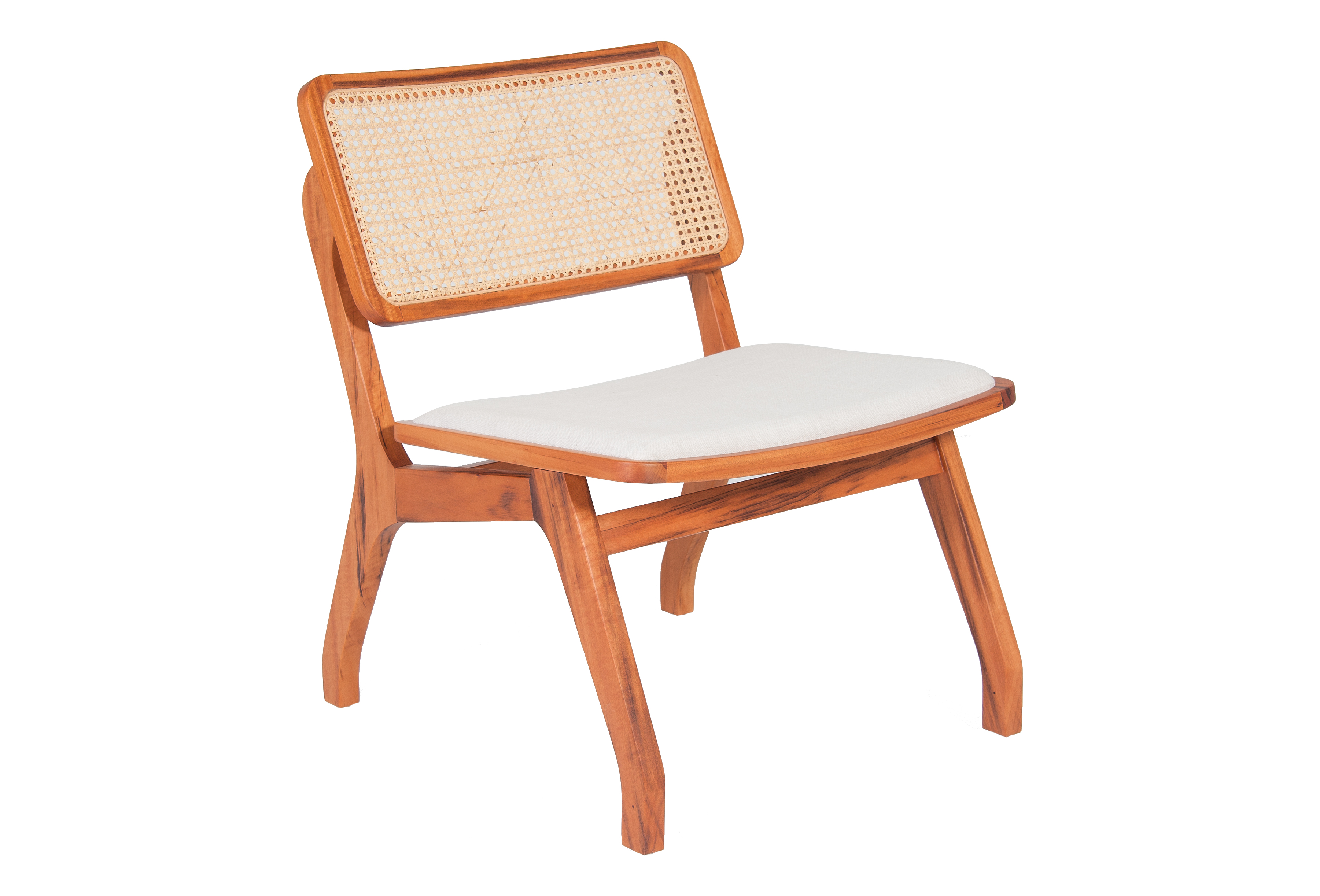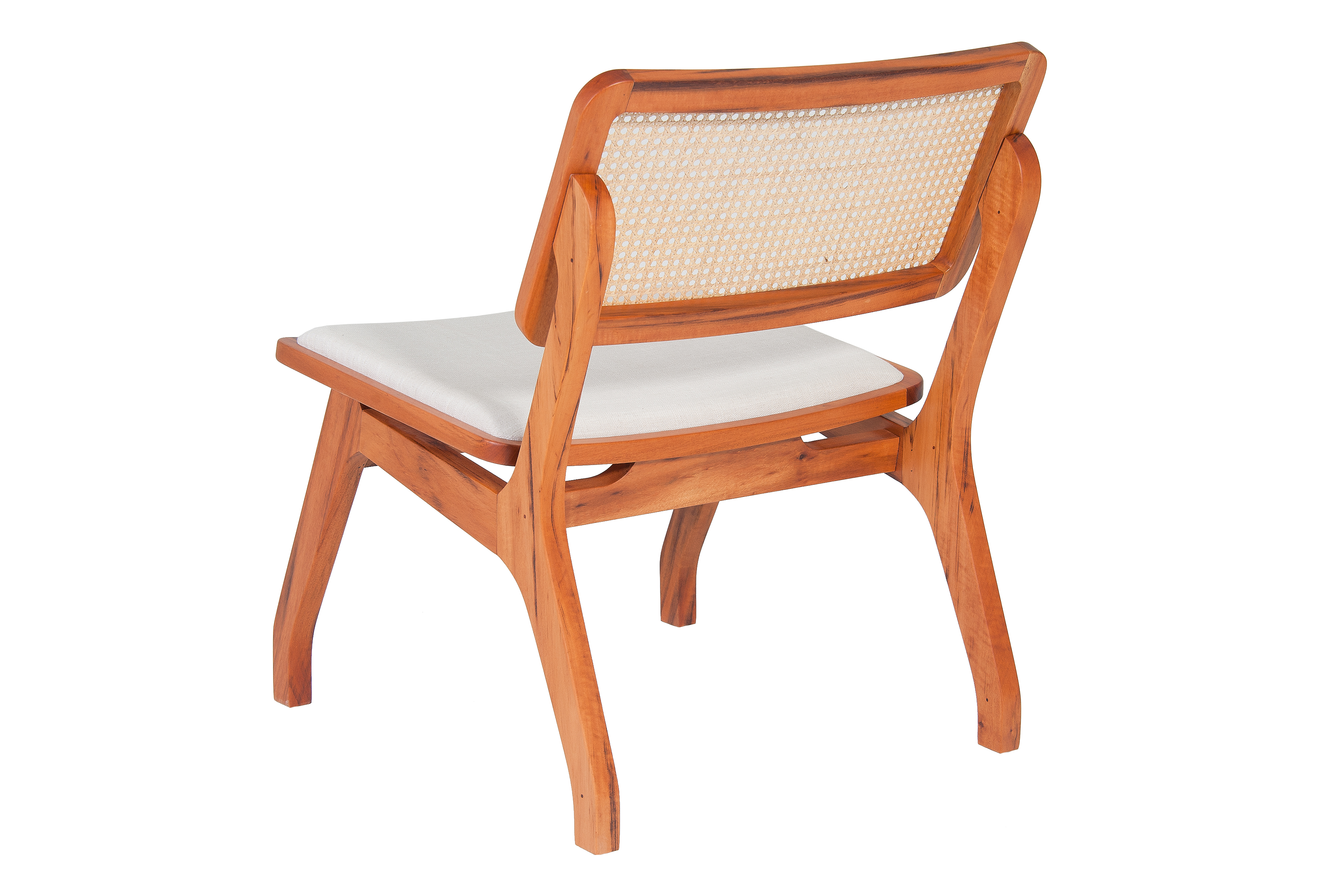Assento estofado e encosto em tela. Madeira maciça e tela natural Rattan